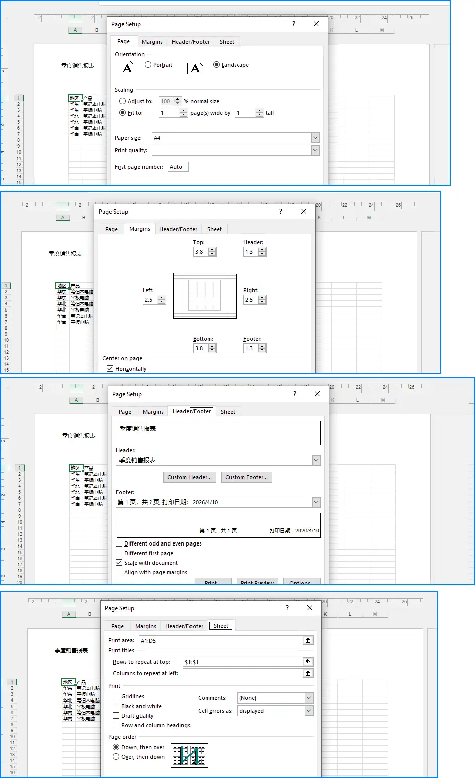 在实际工作中,报表的页面设置通常包括纸张大小、打印方向、页边距、打印区域、打印标题等核心属性。下面通过一个综合示例展示如何设置这些主要属性。
