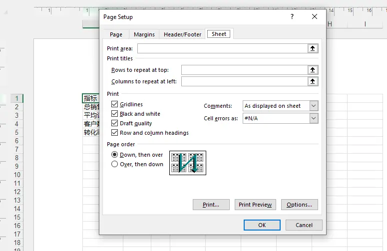IsPrintGridlines:是否打印网格线IsPrintHeadings:是否打印行列标题BlackAndWhite:是否以黑白模式打印Draft:是否以草稿质量打印(加快打印速度)PrintComments:批注打印方式(InPlace表示在原位置打印)PrintErrors:错误值打印方式(NA表示打印为 N/A)