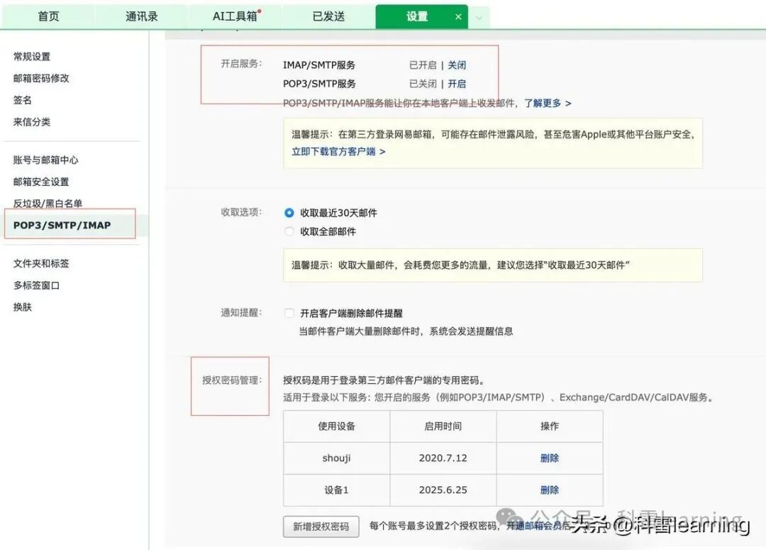 登录自己的邮箱,在设置中,打开SMTP/POP3服务,并新增授权码(授权码个人保存好,后续邮件服务鉴权时会用到)。