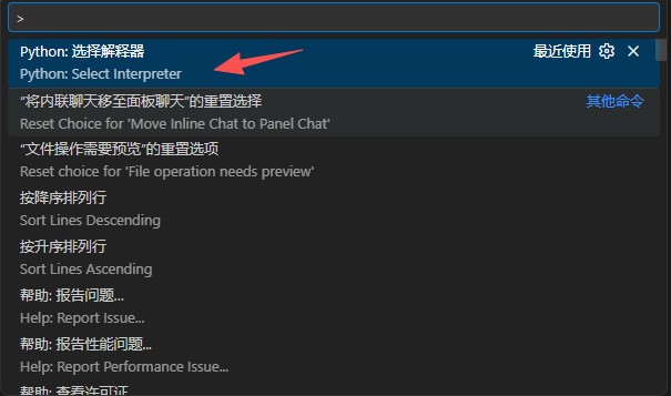 该截图是默认的python解释器。而我们前面已经安装了python3到虚拟环境。所以此处快捷键Ctrl+Shift+p调出查找框: