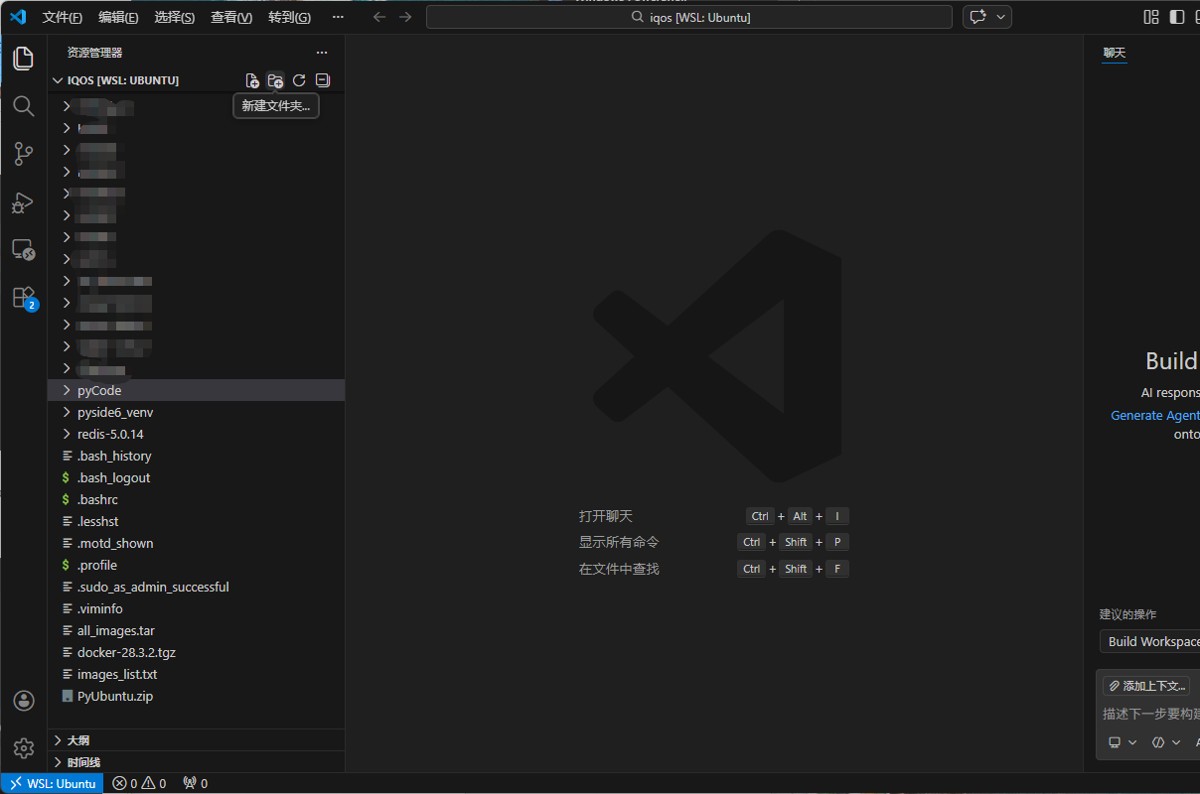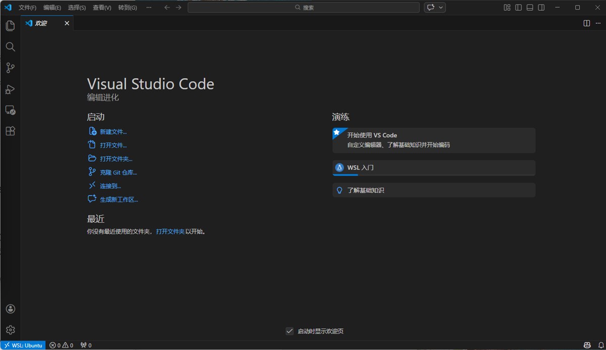 - 此时会打开一个新的 VSCode 窗口,标题栏显示「WSL: Ubuntu」,说明已连接到 WSL 环境。