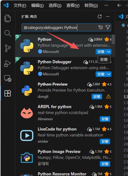 - 在扩展面板的搜索框中输入 Python,找到微软官方的 Python 扩展。