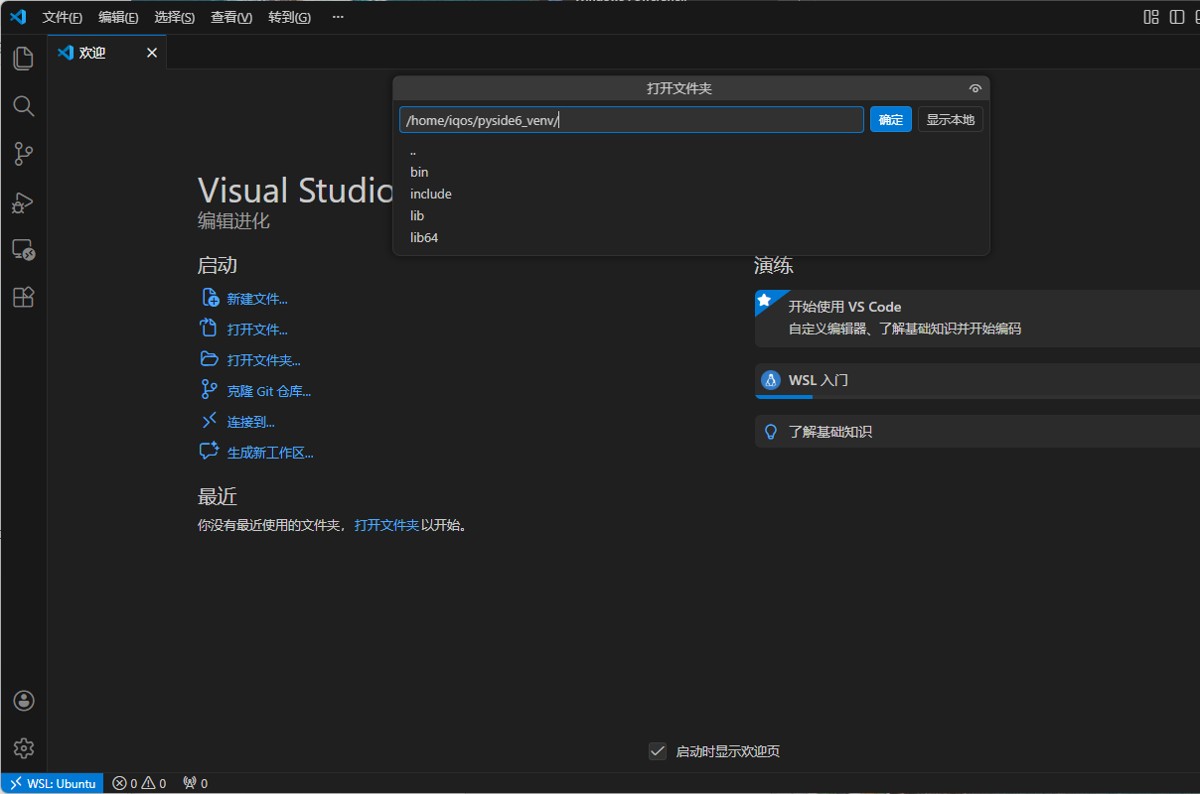 点击左侧的 打开文件夹…,或者按快捷键 Ctrl+K Ctrl+O,在弹出的对话框中选择 WSL 里的项目目录(例如 ~/pyside6_demo)。