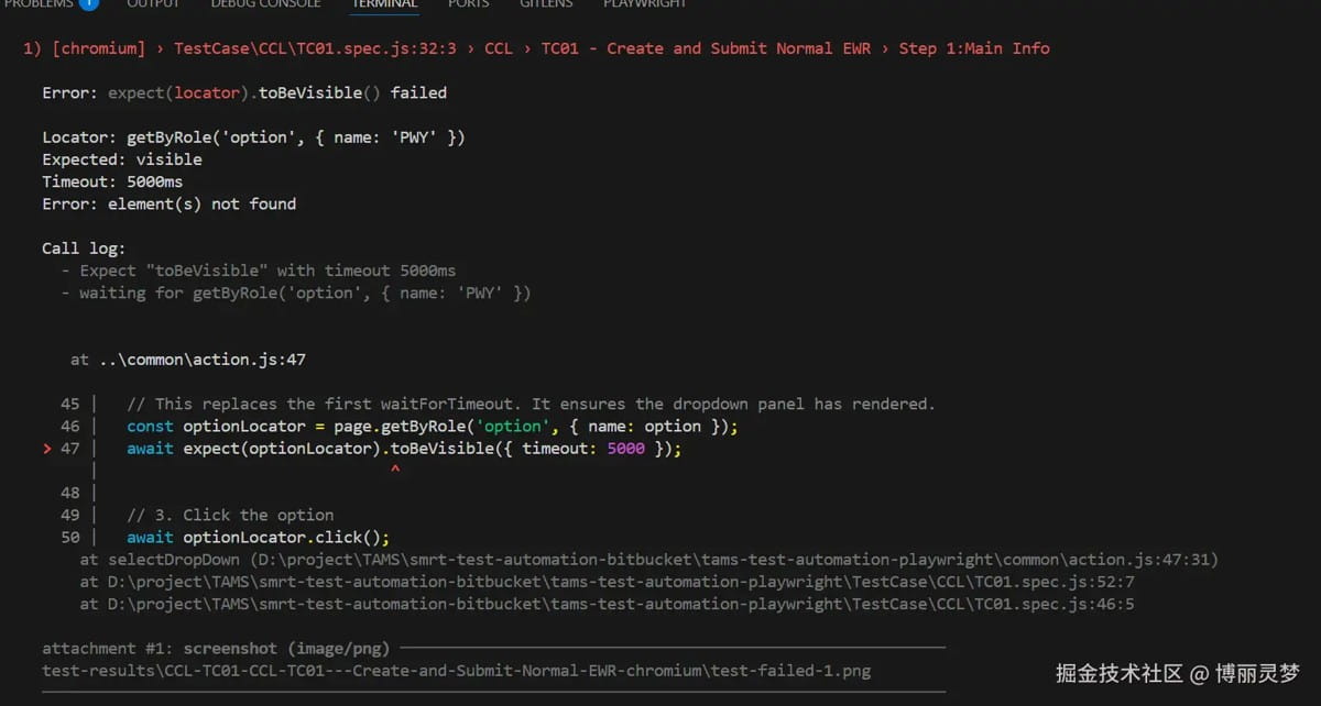 - 因此,getByRole('option') 永远返回空,导致 toBeVisible 超时失败。