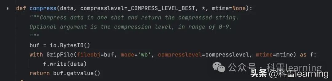 gzip.compress()方法在内存中对字节数据进行压缩,并不生成压缩文件。传入需要压缩的字节数据,返回压缩后的字节数据。