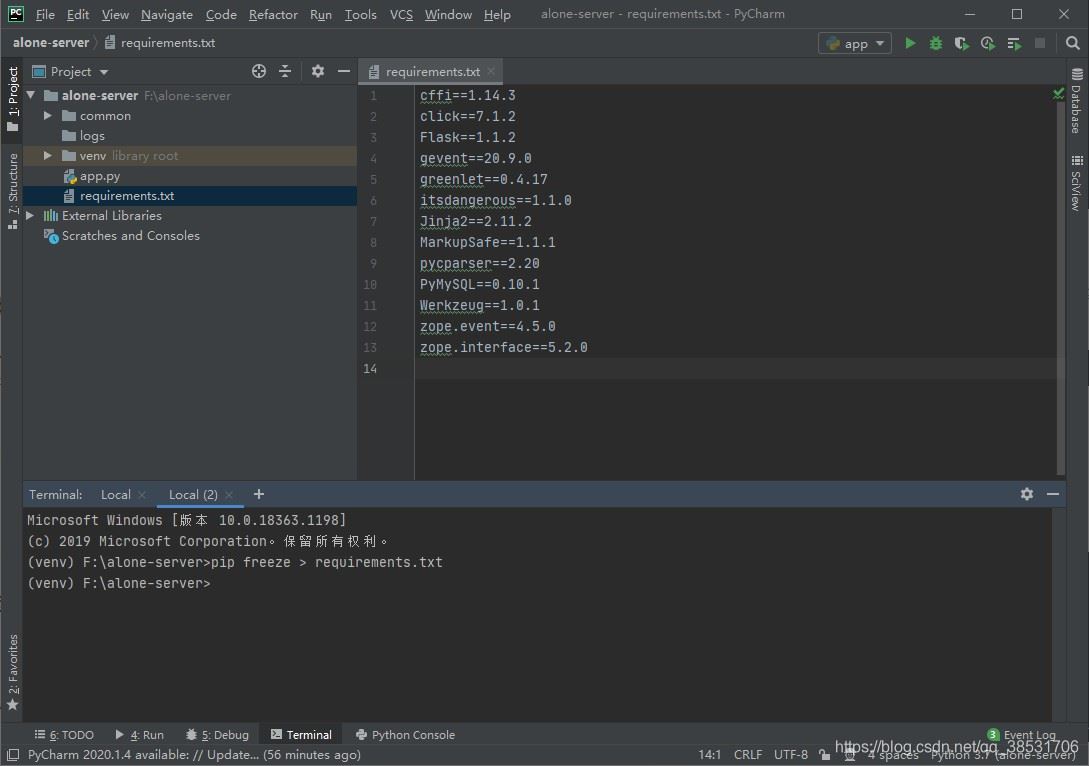 在idea中的项目根目录打开Terminal,执行以下命令(前提已经配置好python环境),会在根目录下生成requirements.txt依赖文件