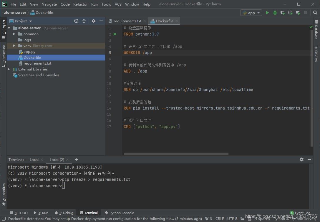 在项目根目录创建Dockerfile,编写执行脚本