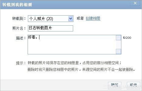 第二步:点击转载按钮会弹出图片转载确认框,框中可选择转载到的相册名(默认:为上次上传/转载的相册)、照片名(默认为:日志转载图片)、照片描述(默认为空)。点击确定后,图片则转载到自己的空间相册内。