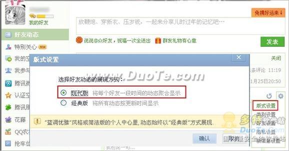 方式一:选择“现代版”,将每个好友一段时间内的动态聚合在一起显示;