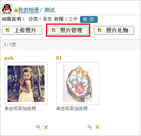 2、进入需要删除照片的相册,点击上方的“照片管理”;