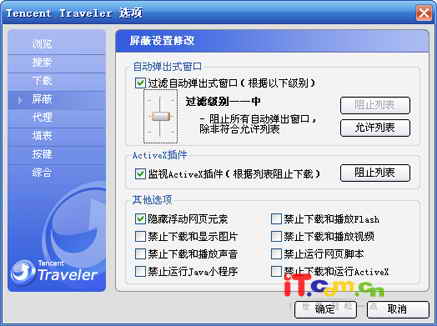 我们也可以点击菜单“工具-TT选项”,在TT选项中进行设置,打开TT选项窗口点击左面的“屏蔽”标签,接着我们可以根据需要来设置过虑窗口的级别,也可以点击右面的“允许列表”按钮来手工添加不要过虑窗口的地址。(图3)