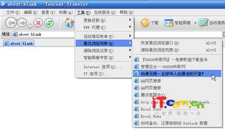 TT浏览器提供的“最近浏览列表”很实用,有了它我们就可以轻松找到因误操作而不小心关闭的网页。点击菜单“工具-最近浏览列表”,里面保存了最近浏览过的15个网页,在使用的时候只要点击相应的网页连接就可以打开了。(图5)