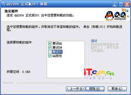 其实我们可以通过卸载QQ组件的方法来进行卸载,双击QQ安装目录里下的“uninst”文件,允许该文件后点击“下一步”按钮,这时会弹出一个选择要卸载组件的窗口,我们只要把“腾讯TT”前面的复选框去掉,再点击“移除”按钮就可以把TT浏览器卸载了。(图6)。