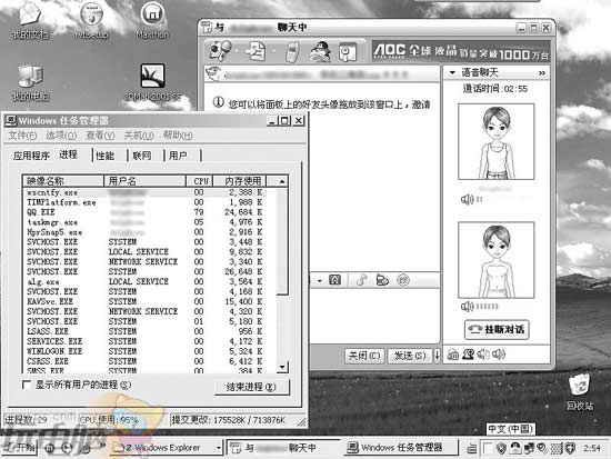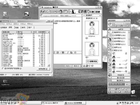 “超级语音”到底占用了多少系统资源,笔者就给大家展示一番。笔者的电脑,配置为Celeron 633MHz处理器+PC133 SDRAM 128MB×2内存+i815EP主板,使用“超级语音”后,CPU使用率一般为75%左右,如果使用“多人超级”语音(仅三人通话的情况下),CPU占用 率立马上升至80%,根本无法进行其它操作,偶尔还出现系统假死的现象。所以笔者再也不敢轻易使用新版本的超级语音或者视 频 聊 天功能。