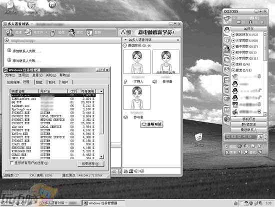 启动新版的QQ(笔者现在使用QQ2005贺岁版),再次开启QQ的“超级语音”功能和朋友聊天。这时可以从任务管理器中看到CPU使用率明显 降低了,仅为20%左右,通话的语音质量虽然有一定降低,但是一般不影响通话,而且可以在语音聊天时同时运行其它程序,提高电脑的利用率 。