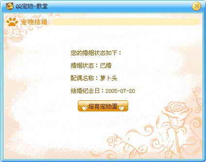 - 结婚后的Q宠宝贝可以在大教堂的山羊牧师处查询自己的婚姻信息。如:您已经结婚,您的结婚纪念日是:2005年3月8日,配偶是:×××。