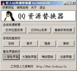 新手改换QQ登录界面、等级图标只需三秒:有没有看过很漂亮的QQ界面和等级图标?是否也想把自己的QQ变成那样?用狂人QQ资源替换器来做吧,三秒钟搞定! 这个程序能让新手迅速的制作好一个属于自己专用的QQ登