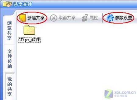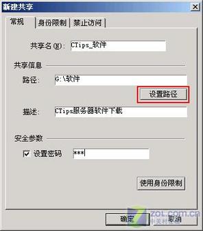 在服务器上单击“QQ菜单→工具→共享文件”命令,打开“共享文件”窗口,然后在窗口上方单击“新建共享”按钮(如图1),弹出“新建共享”设置窗口,在“常规”标签中我们首先需要设定一下共享的文件夹,单击如图2所示中的“设置路径”按钮,选择服务器中的软件目录,选定后单击“确定”按钮。接下来要在“常规”标签中分别设置“共享名”和“设置密码”,这样设置的好处是让访问的同事能了解该文件夹的作用,并且通过密码才能访问服务器中的文件,增强了安全性。