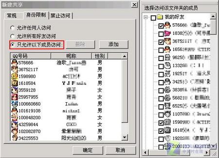 首先告诉同事添加服务器上QQ号码(本例为588888)为好友,一人在服务器配合同事完成好友的添加,使该QQ号码上都有同事们的号码。然后在如图2所示的“共享文件”窗口中单击“身份限制”标签,勾选“只允许以下成员访问”选项,然后单击旁边的“添加”按钮选择允许访问该共享文件夹的同事,选择完毕后允许访问该文件夹的同事就会出现在如图3所示的窗口中了。