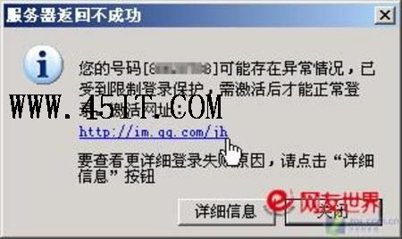 近来,腾讯公司加大了对QQ帐号的保护力度。这不,今天笔者一登录QQ,就遇到了“服务器返回不成功”的对话框(如图1)。细想了一下,原来是昨天直接在QQ设置窗口里改QQ密码造成的。因为前不久,腾讯发了篇关于QQ密码修改方式变更