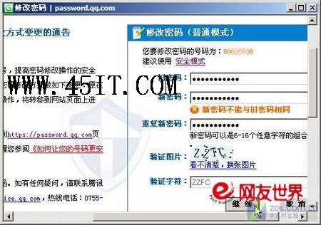 在浏览器里打开页面https://password.qq.com/,先以原密码登录QQ帐号,可点击“安全模式”链接,以安全模式进行登录。登录后,按页面要求输入旧密码、新密码,然后填写验证字符,最后点击“继续”按钮(如图2)。一会儿后,页面提示“您的密码已经修改成功”。