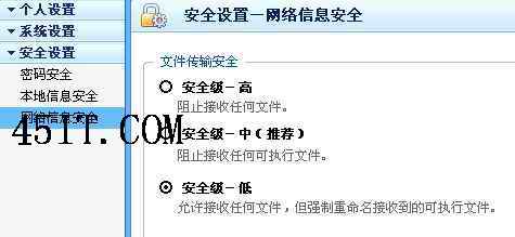 进入QQ菜单-安全中心-安全设置-网络信息安全-文件传输安全-设置成“安全级-低”即可。如图:
