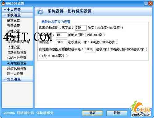 打开QQ聊天窗口,在工具栏上单击“捕捉屏幕”下拉菜单,选择“影片截图设置”,打开“影片截图设置”对话框,在这里可以进行动态影片截取设置,幻灯片通常是由多张图片组成并能连续播放,因此我们可以设置捕获每帧画面的时间间隔和所需的帧数量,然后将动态图片的播放速率设置为最大(图2)。