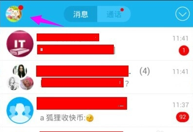 在消息提示点击左上角处的QQ头像。如图: