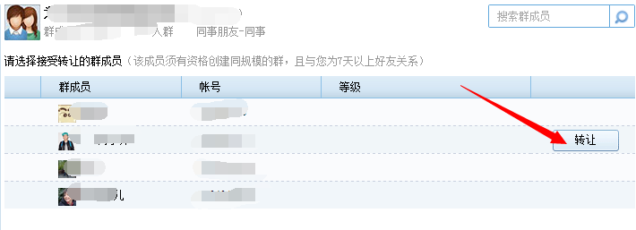 2、进入页面后,系统会自动跳转至QQ中心,大家可以直接找出自己想要转让群的人,左右边会显示转让,直接点击即可转让了。