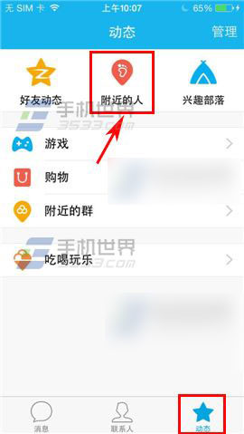 1)首先打开手机QQ,点击【动态】,点击【附件的人】,进入界面就能查看附近联系人,点击选择附近联系人。(如下图)