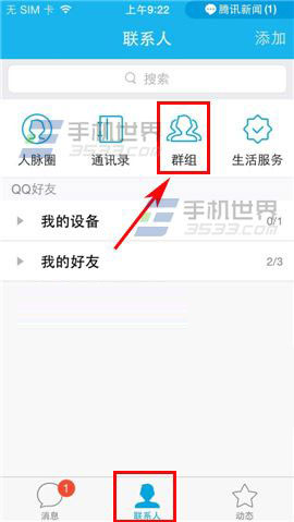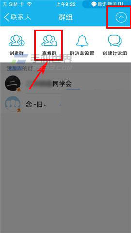 1)首先打开手机QQ,点击【联系人】,点击【群组】,在右上方点击【圆圈标志】点击【查找群】。(如下图)