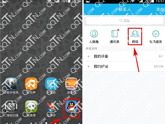 1、打开手机QQ,在【联系人】栏找到并点击进入【群组】。