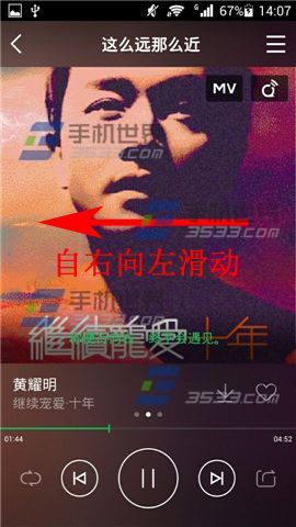 1)打开手机QQ音乐,进入歌曲的播放页面,在屏幕上自右向左滑动进入歌词页面。(如下图)