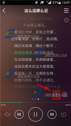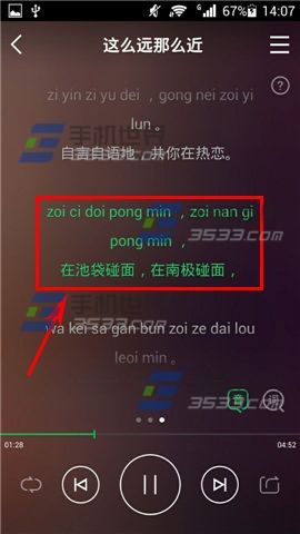 2)点击右下角的【音】(需是粤语或者外语歌曲)就可以使用音译歌词了,歌词上都会标注每个字的读音。(如下图)