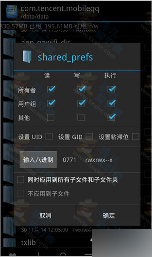1、首先手机QQ登录一个小号,把大号(要刷标签的号)的个性标签都拉到头像那。然后摁房子键,让qq后台运行。再打开RE管理器“data/data/com.tencent.mobileqq”往下翻,找到“shared_prefs”,然后长按选择权限,把打勾勾都去掉!如下图: