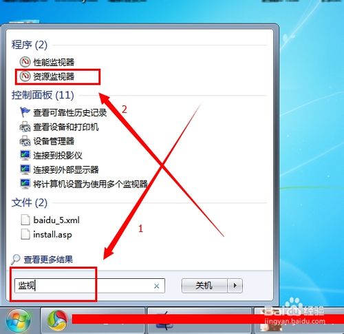在搜索那里输入“监视” , 然后点击“资源监视器” 如图