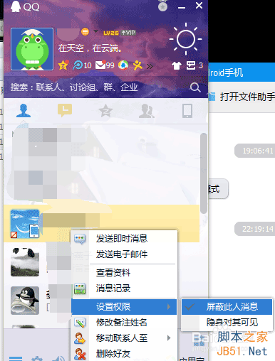 查看自己刚才给这个主动屏蔽的QQ信息有没有同步到手机上。