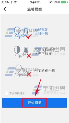 3)进入界面点击【开始扫描】,进入扫描将正脸对准屏幕,并保持静止。(如下图)