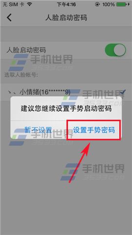 5)在界面点击开启【人脸启动密码】,弹出窗口点击【设置手势密码】。(如下图0