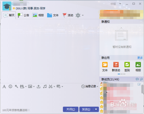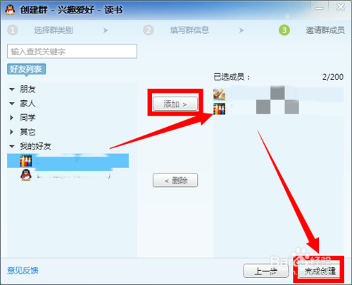 群消息搞定以后,接着下来的就是邀请一些群成员入群了。我们可以在左边的好友列表里面单击选中一些特定的好友,点击添加按钮,把他们添加到群里面去。成员添加好以后,再点击下面的“完成创建”按钮即可