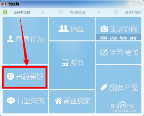 创建以后,首先我们就要考虑我们的QQ群的类别作用。我们建立的QQ群是拿来做什么用的,是为了兴趣爱好在一起的,还是工作事业的需要等等。根据自己建群的目的,在群类型窗口上单击选择就好