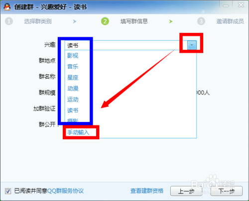 接着就是群消息的填写内容了。比如我们刚才选择的是兴趣爱好,那么,我们就可以在兴趣一栏选择或者手动输入自己的兴趣是什么了