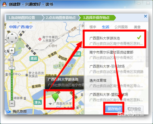而群地点也很方便设置,我们在群地点一栏点击一下,就会弹出如图所示的地图,用自己的鼠标拖动着地图,找到自己的所在位置以后,单击地图上的地址,在地图的右边就会出现很多个地址,选择自己需要的地址,再点击下面的“保存地址”即可