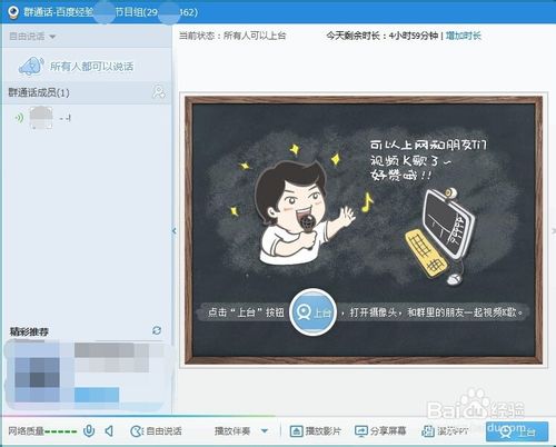 3、打开后就会显示如下的界面,这里可以看到当前加入的人数,中间部分是显示面板,最后侧是群里实时的聊天内容。