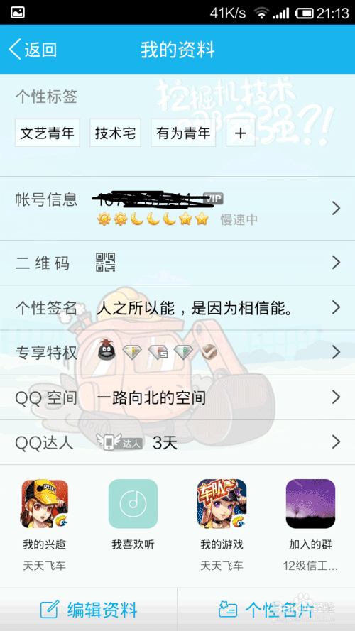 2、进入QQ资料栏目后,可以看到账号信息下面有一个二维码图标选项。我们点击二维码