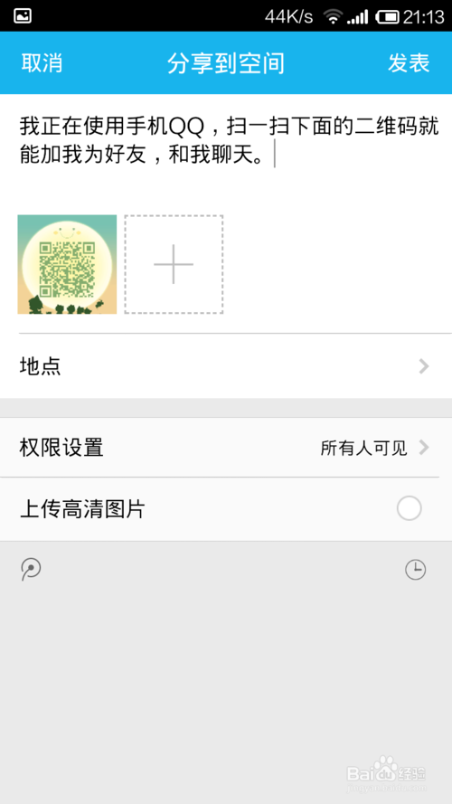 6、点击分享到空间,还可以把自己手机QQ的二维码分享给好友,让好友方便加利用自己的手机扫描我们分享的二维码就能轻松的加我们QQ号码,方便又省事。