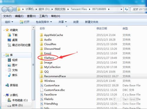 5、打开个人文件夹,fileRecv文件夹就是QQ接收文件的意思,这里面包含着接收的图片,打开这个文件夹可以看到接收的图片。
