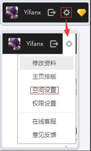 2、把鼠标箭头移到右上方QQ空间右上方的小齿轮处,然后就会弹出选项,点击”空间设置“: