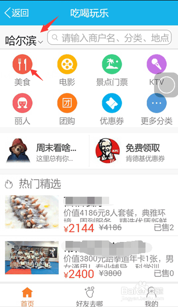 3、可以选择你所在的城市,如果我们要找美食的话,点开美食