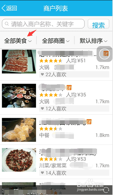 4、这里会显示你附近的一些美食,你可以从中做出选择,点开"全部美食"里面有更详细的划分